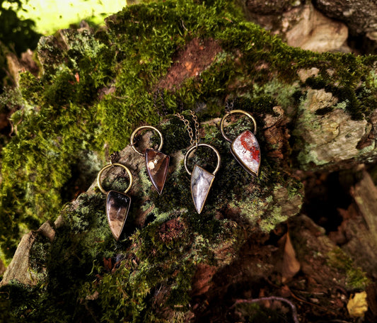 Série de pendentifs en laiton patiné et en pierre, en forme de griffe, sur chaine en maille moyenne en laiton.