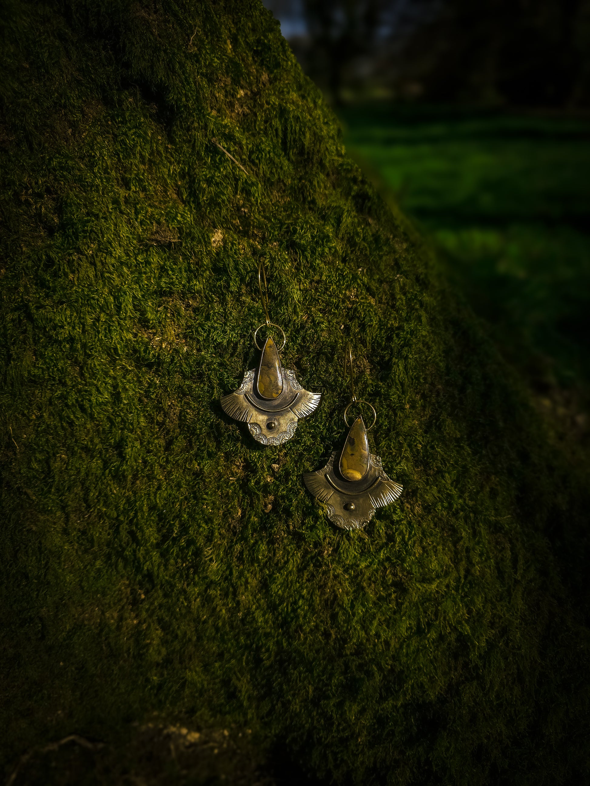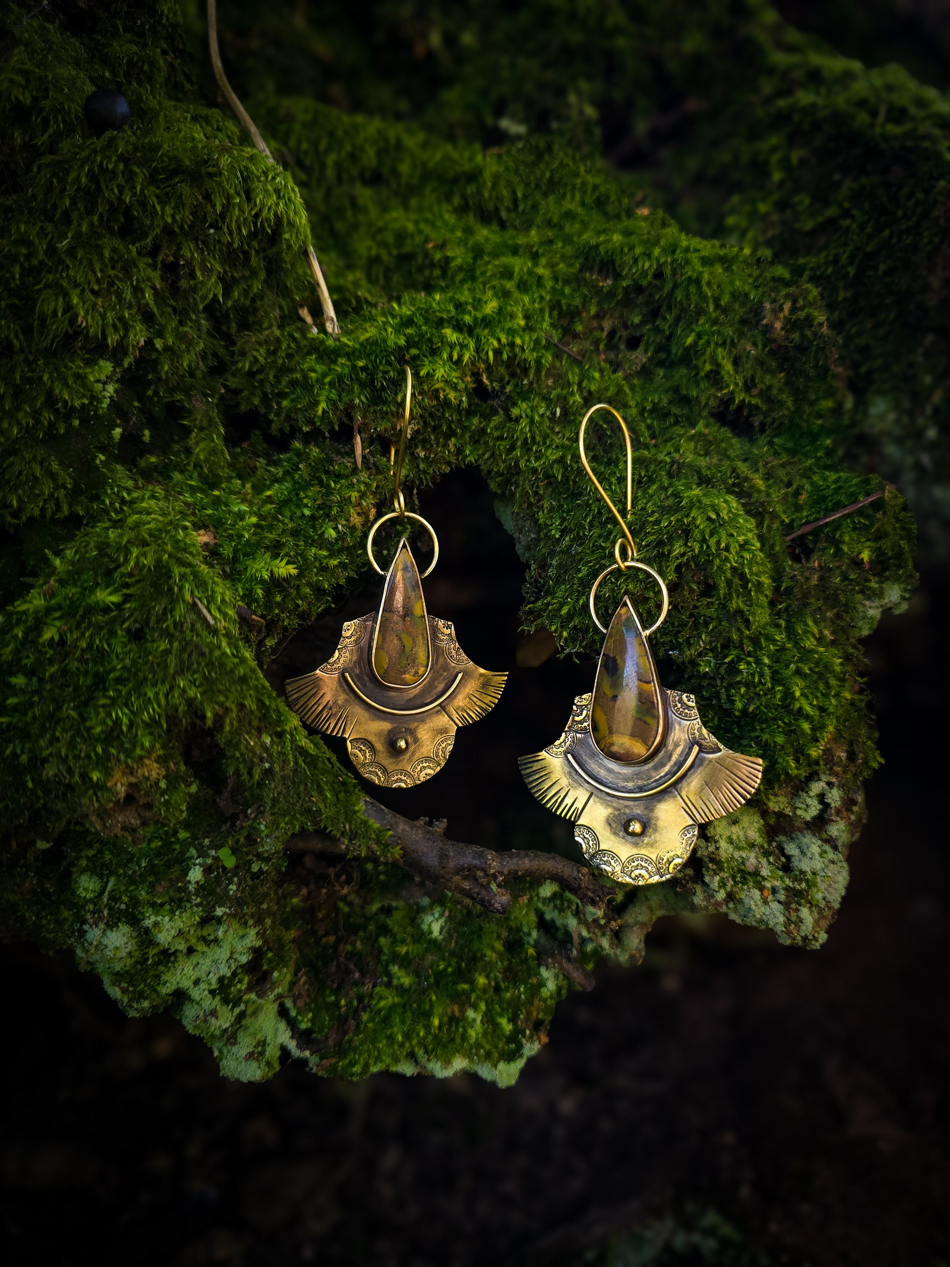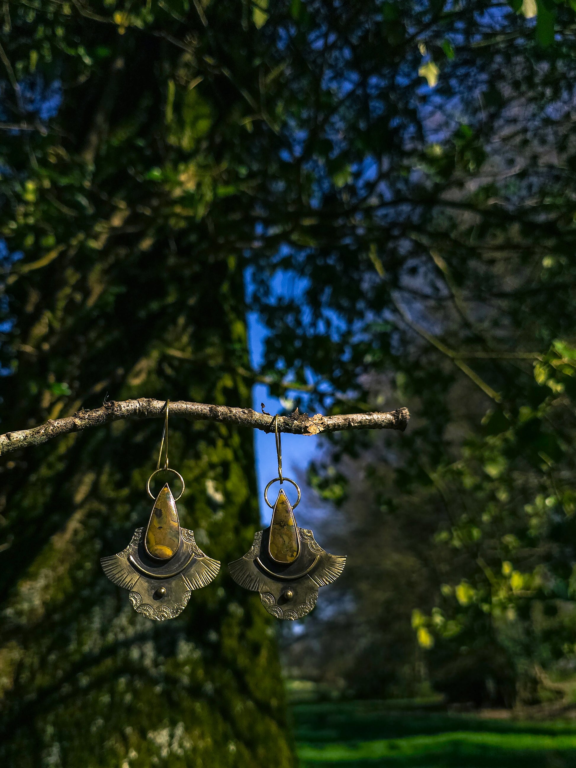 Boucles d'oreilles AYLAL en laiton patiné et martelé et en jaspe. Les crochets sont en laiton 1mm