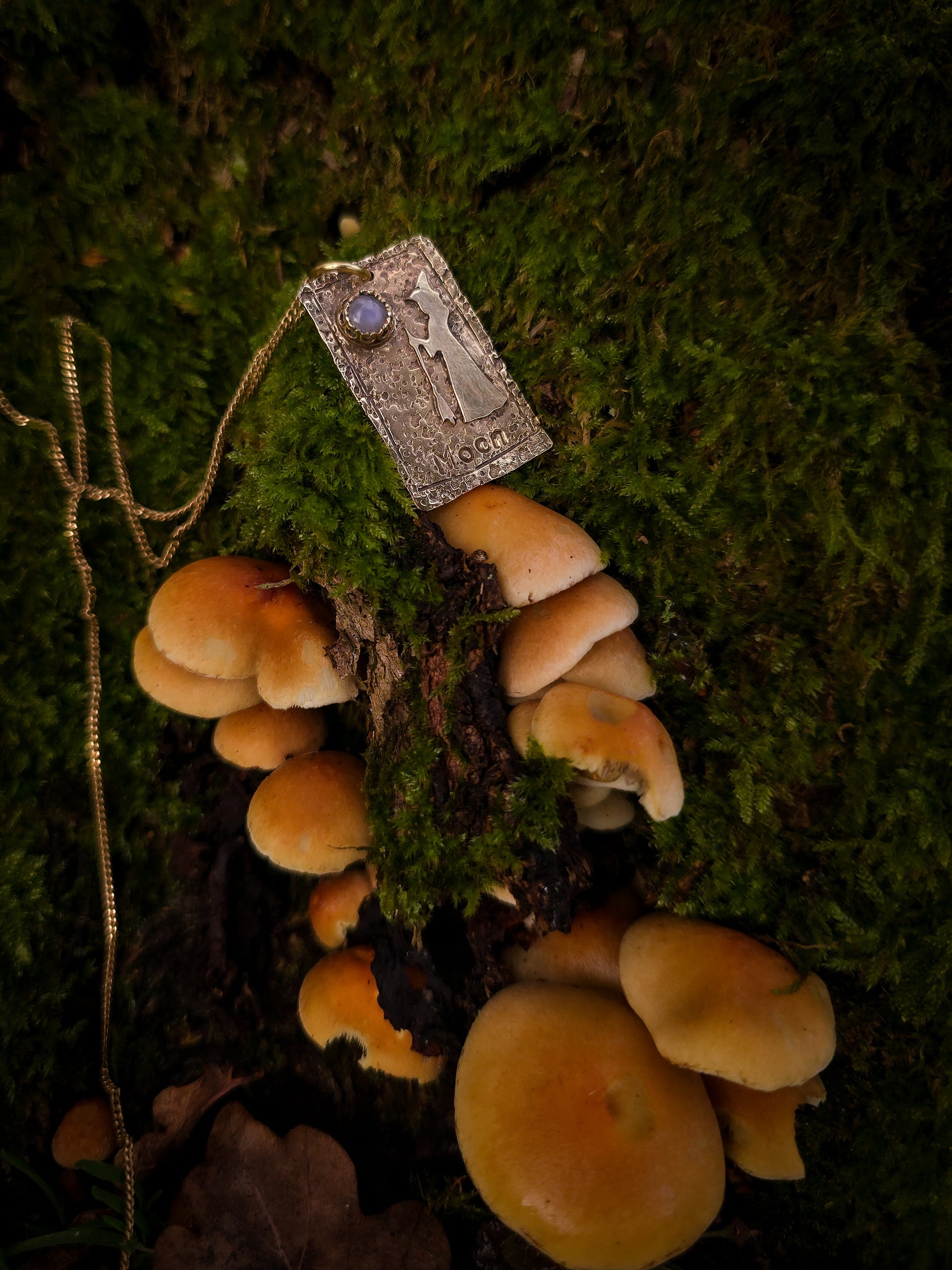 Pendentif en laiton et en pierre de lune. Il est réalisé dans la forme d'une carte de tarot, inscrit "Moon" avec une sorcière en relief.